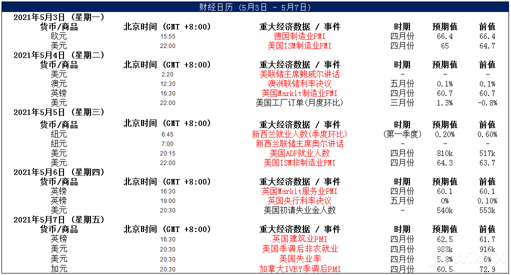 周四,美元指数下跌41%,主要是因美债收益率持续维持低位,以及市场认为今年通胀上升不太可能引发加息。今晚20:30,美国将公布4月季调后非农就业人口和失业率,市场预期4月将新增就业97.8万人,失业率为5.8%。随着疫苗接种持续快速推进,美国的劳动力市场有望进一步恢复。因此,短线美元指数仍然承压,但下行空间或许不大。
