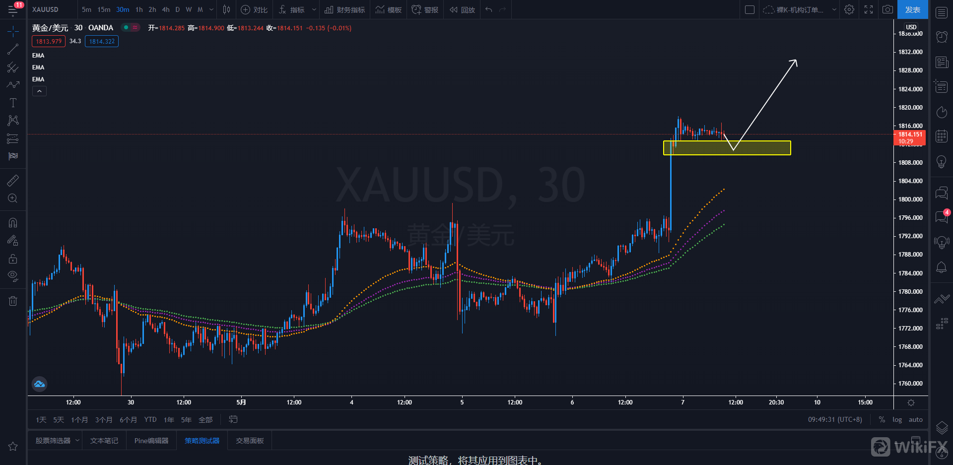 策略解析:黄金30分钟隔夜强势拉升,价格继续保持并站稳在均线系统上方运行,后市或将继续持续上行,逢低买入为主。日内关注价格再次回踩1812.80-1809.70区域的机会,可择机逢低买入黄金,上看目标1830一线附近甚至更高。