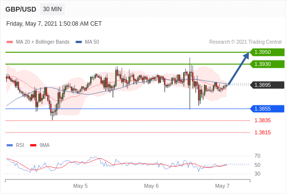 交易策略: 在 1.3855 之上,看涨,目标价位为 1.3930 ,然后为 1.3950 。