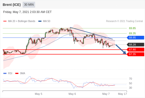 交易策略: 在 68.95 之下,看跌,目标价位为 67.80 ,然后为 67.35 。