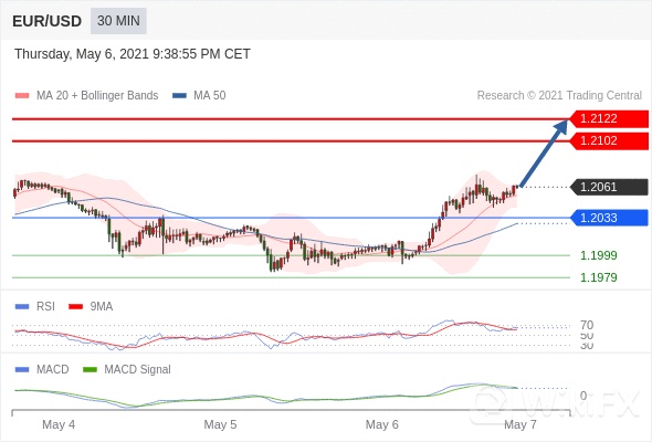 欧元/美元 当日内: 看涨,当 1.2033 为支撑位,目标定在1.2122。 转折点为:1.2033 交易策略:看涨,当 1.2033 为支撑位,目标定在1.2122。备选策略:如跌破 1.2033 ,EUR/USD 目标方向定在 1.1999 和 1.1979 。 技术点评 :RSI技术指标超过50。 MACD技术指标呈现看多状态并 处在其信号线的下方。 此外,价位高于其20天及50天移动平均线 ( 分别位于 1.2053 和 1.2028 )。