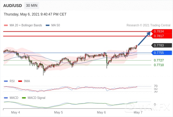 澳元/美元 当日内: 看涨,当 0.7755 为支撑位。 0.7755 作为转折点。 交易策略:看涨,当 0.7755 为支撑位。备选策略:向下跌破 0.7755 ,将带来继续下跌的趋势,目标位为 0.7727 然后为 0.7710 。 技术点评 :RSI技术指标大于中性区域50。 MACD技术指标处在其信号线之上 看多。 此外,价位处在其20天及50天移动平均线上方 ( 当前是 0.7763 和 0.7750 )。