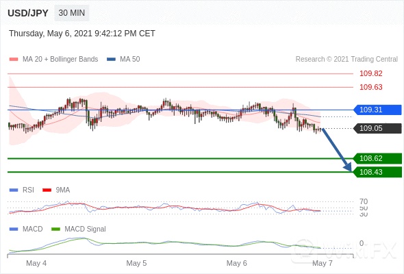 美元/日元 当日内: 看跌,在 109.31 之下。 109.31 作为转折点。 交易策略:看跌,在 109.31 之下。备选策略:向上突破 109.31 ,将带来继续上行的趋势,目标位定在 109.63 和 109.82 。 技术点评 :RSI技术指标低于50。 MACD技术指标呈现看跌状态并 处在其信号线的下方。 此外,价位低于其20天及50天移动平均线 ( 分别位于 109.13 和 109.21 )。