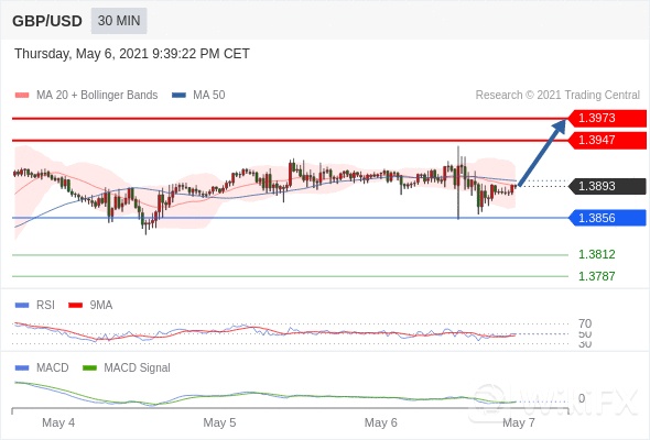 英镑/美元 当日内: 有上涨的可能,目标价位定在 1.3973 。 转折点定在:1.3856 交易策略:有上涨的可能,目标价位定在 1.3973 。备选策略:向下跌破 1.3856 ,将带来继续下跌的趋势,目标位为 1.3812 然后为 1.3787 。 技术点评 :RSI技术指标小于中性区域50。 MACD技术指标处在其信号线之上 看空。 另外,价位在其50天移动平均线以下 ( 1.3900 ) 但高于20天移动平均线 ( 1.3893 )。