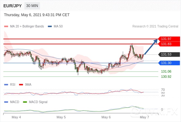 欧元/日元 当日内: 看涨,当 131.30 为支撑位,目标定在131.97。 转折点定在:131.30 交易策略:看涨,当 131.30 为支撑位,目标定在131.97。备选策略:向下跌破 131.30 ,将带来继续下跌的趋势,目标位为 131.06 然后为 130.92 。 技术点评 :RSI技术指标大于中性区域50。 MACD技术指标处在其信号线之下 看多。 另外,价位在其20天移动平均线以下 ( 131.54 ) 但高于其50天移动平均线 ( 131.36 )。