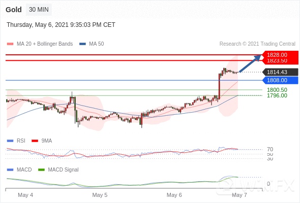 Gold 当日内: 看涨,当 1808.00 为支撑位,目标定在1828.00。 1808.00 作为转折点。交易策略:看涨,当 1808 为支撑位,目标定在1828。 备选策略:如跌破 1808 ,Gold 目标方向定在 1800.50 和 1796 。 技术点评 :RSI技术指标大于70。在这种情况下,说明有很强的上升趋势,或者意味着处在超买的状态下,可能会有向下的调整。我们将观察RSI技术指标是否出现背离现象。 MACD技术指标处在其信号线之下 看多。 此外,价位高于其20个时期及50个时期移动平均线 ( 分别位于 1807.10 和 1796.14 )。
