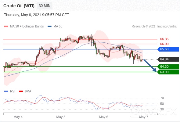原油 (WTI)(M1)当日内: 存在压力。转折点:65.60 交易策略:在 65.60 之下,看跌,目标价位为 64.30 ,然后为 63.90 。 备选策略:在 65.60 上,看涨,目标价位定在 66.00 ,然后为 66.35。 技术点评:RSI技术指标看跌,有进一步下降空间。