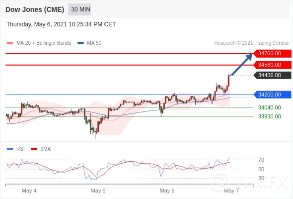 美国道琼斯30指数 (M1)当日内: 新一轮上升。转折点:34200.00 交易策略:在 34200.00 之上,看涨,目标价位为 34560.00 ,然后为 34700.00 。 备选策略:在 34200.00 下,看空,目标价位定在 34040.00 ,然后为 33930.00。 技术点评:RSI技术指标向上运行。