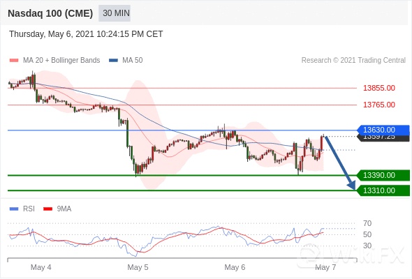 美国纳斯达克100指数期货 (M1)当日内: 短期关键阻力位在13630.00。转折点:13630.00 交易策略:在 13630.00 之下,看跌,目标价位为 13390.00 ,然后为 13310.00 。 备选策略:在 13630.00 上,看涨,目标价位定在 13765.00 ,然后为 13855.00。 技术点评:只要依旧存在13630.00阻力位,价格波动存在看跌的趋势。