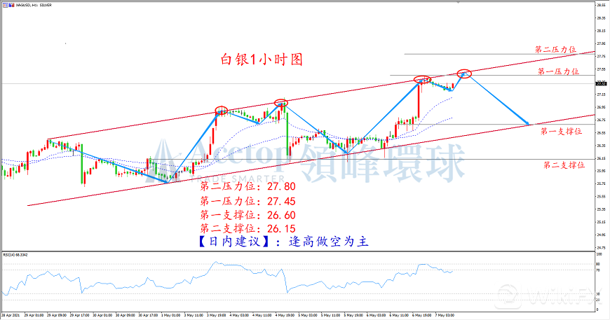 白银1小时图上,多头突破前期平行压力26.80位置后上行至27.45附近,目前在高位横盘整理。从均线上看,MA20和MA60金叉上行,目前均线金叉开口发散,有调整修正的迹象;从RSI技术指标上看,目前指标系数处于高位,有调整修正的迹象;从K线形态上看,K线结构和前通道K线结构有相似构建双顶之处,日内调整回调的概率较大,操作上建议逢高做空的思路进行布局。
