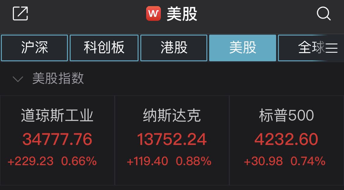 截至收盘,道琼斯工业指数涨229.23点,涨幅0.66%,报34777.76点;纳斯达克指数涨119.4点,涨幅0.88%,报13752.24点;标普500指数涨30.98点,涨幅0.74%,报4232.6点。