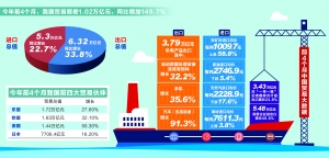 按国别看,我国与主要贸易伙伴进出口均增长。前4个月,我国对东盟、欧盟、美国、日本分别进出口1.72万亿元、1.63万亿元、1.44万亿元和7706.4亿元,分别增长27.6%、32.1%、50.3%和16.2%。其中,东盟为我国第一大贸易伙伴,占我国外贸总值的14.8%。同期,我国与“一带一路”沿线国家进出口合计3.43万亿元,同比增长24.8%,占我国外贸进出口总值的29.5%。