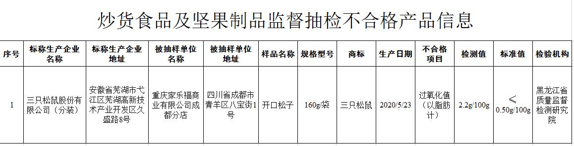 6日,市场监管总局发布关于20批次食品抽检不合格情况的通告显示,重庆家乐福商业有限公司成都分店销售的、标称安徽省芜湖市三只松鼠股份有限公司分装的开口松子(160g/袋,2020/5/23),过氧化值(以脂肪计)检测值为2.2g/100g。而《食品安全国家标准 坚果与籽类食品》(GB 19300—2014)中规定,熟制坚果与籽类食品(除葵花籽外)中过氧化值(以脂肪计)的最大限量值为0.50g/100g。