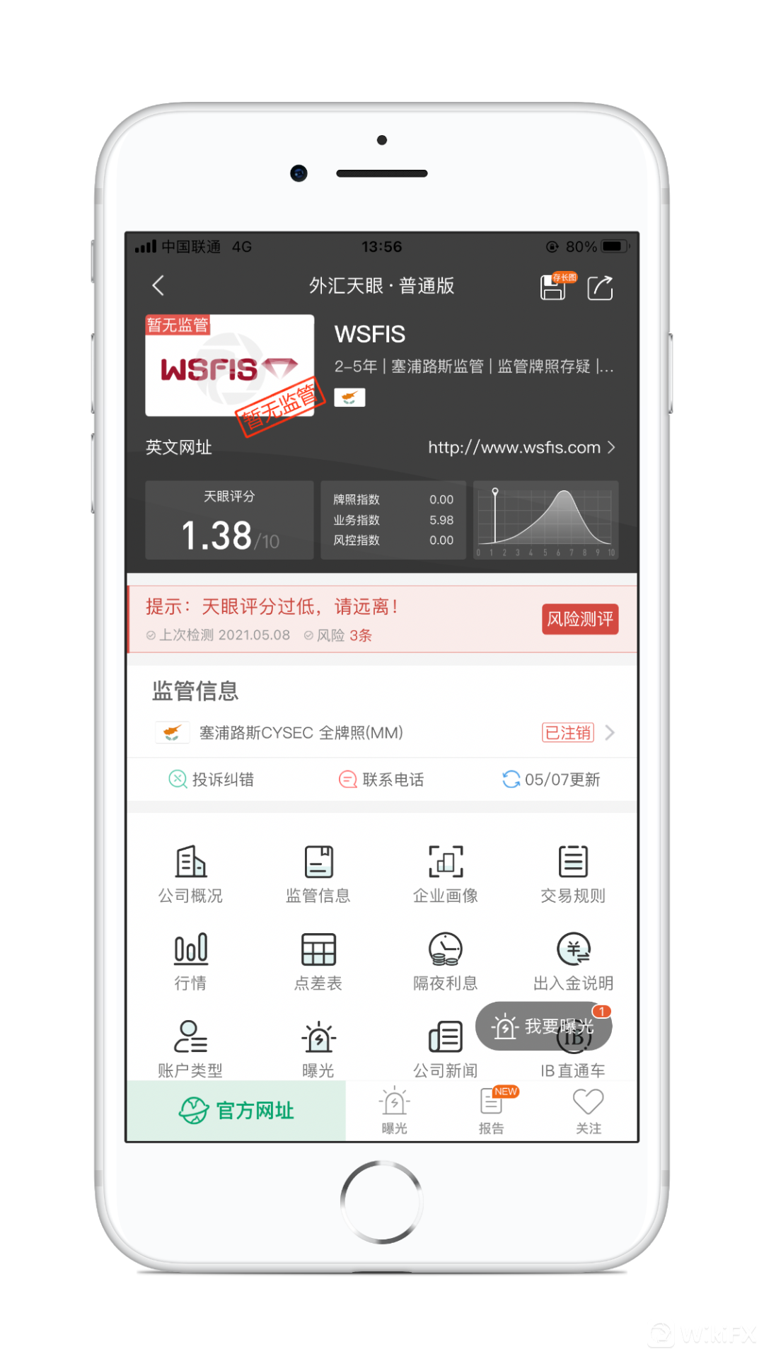 WSFIS,天眼评分1.38分,所持牌照被撤销后,当前没有任何实际有效监管,存在巨大风险,建议投资者提高警惕。
