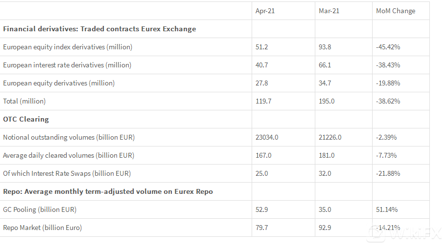德意志交易所公布了2021年4月的Eurex和EEX的交易量,该公司的交易量与2021年3月环比有所下降。